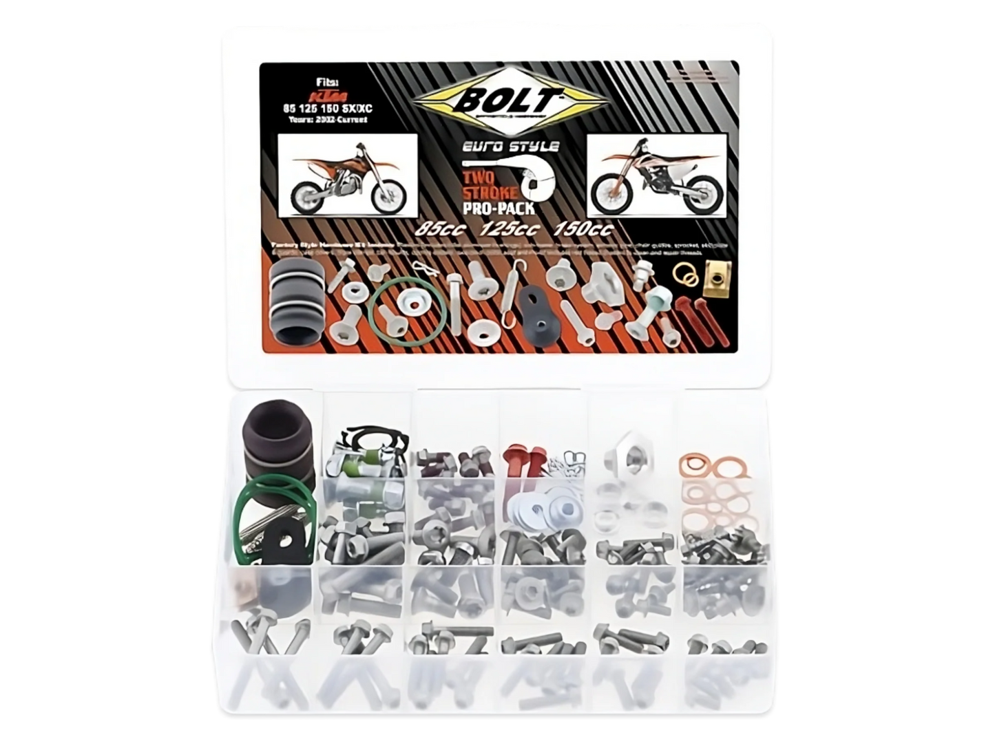 Bolt Euro Style Pro sættet indeholer karrosseriebefæstelser og aluminiumsbøsninger, rotorbolte, et komplet sæt tandhjulsbolte, Fuji låsemøtrikker, gevindskærere og drænpropskiver.