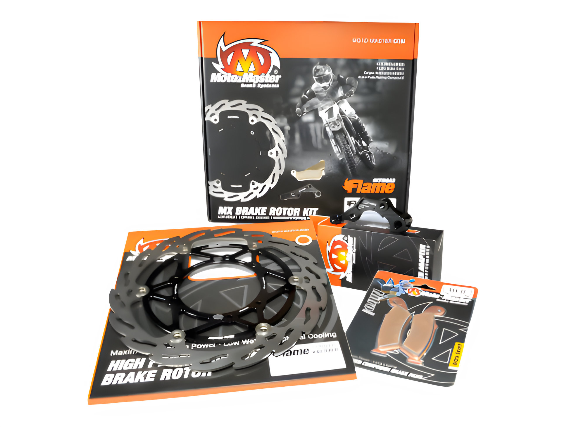 Moto-Master Flame 270 mm bremsesættet inkluderer; Flame MX 270 mm forrotor, Billet kaliber beslag og Moto-Master Nitro Sport bremseklodser.